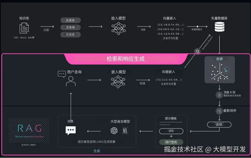 - 生成最终答案:将排序后的原始内容拼接到提示词模板中,与用户输入的文字一起交给大模型,接收AI的返回结果