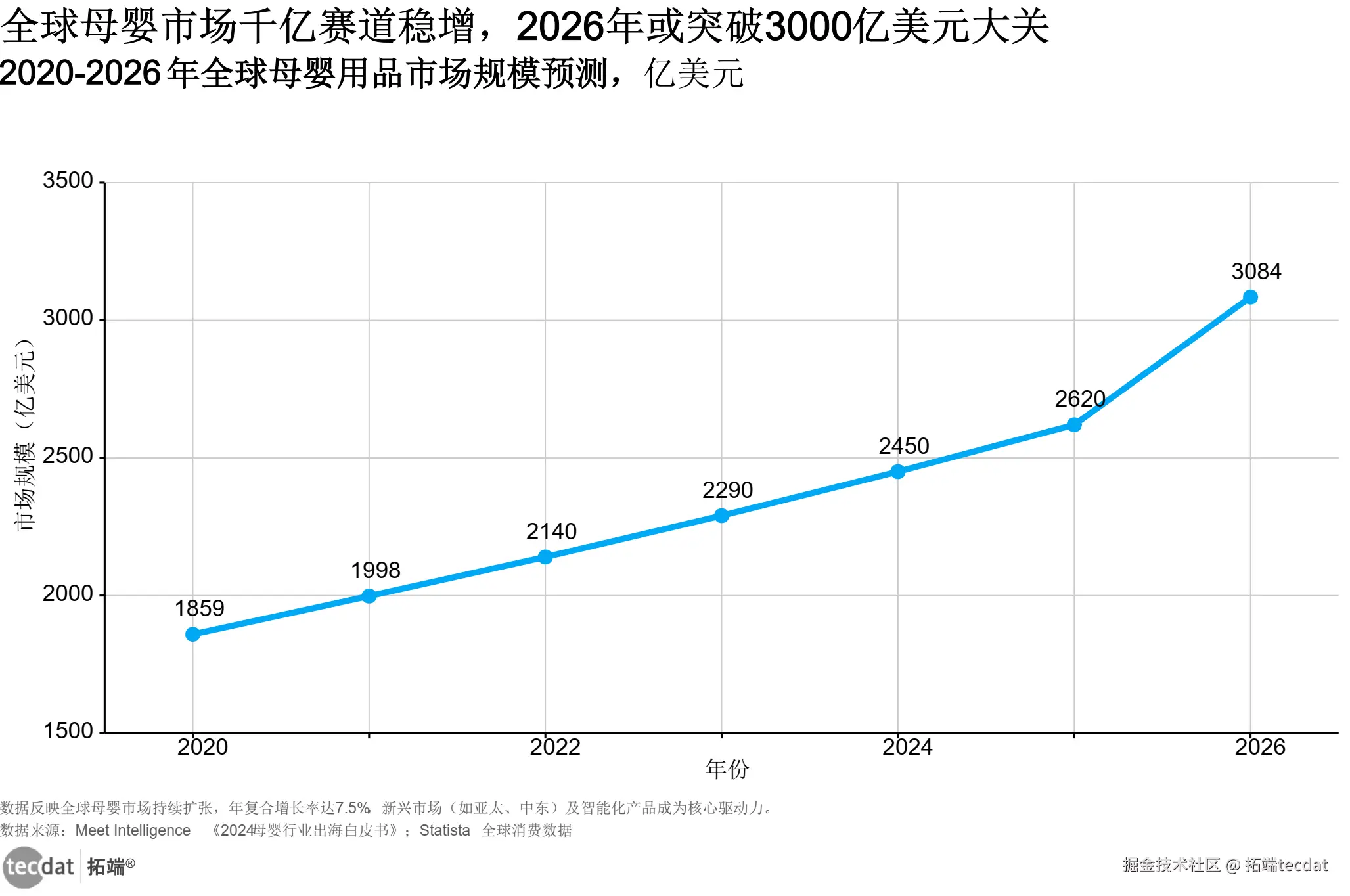 全球母婴市场正经历结构性增长,一面是欧美成熟市场的品质消费升级,一面是东南亚、中东等新兴市场的人口红利释放。2020至2026年,全球母婴市场规模将从1859亿美元增至3084亿美元,年复合增长率达7.5%,这一增长既来自新生儿基数的自然增长,更源于父母对精细化育儿的投入提升。