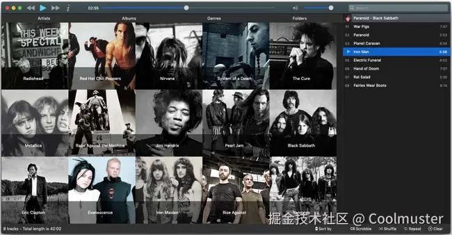 Musique 确实是一款性能卓越的Mac媒体播放器。程序界面清晰易用,操作灵活,功能丰富。这款软件能够按音乐家和专辑以精美的马赛克拼贴方式排列音乐,这真是令人惊叹。这款程序的一个独特之处在于它能够保留音乐合集的文件类型,并精确地按照音乐的结构进行显示。
