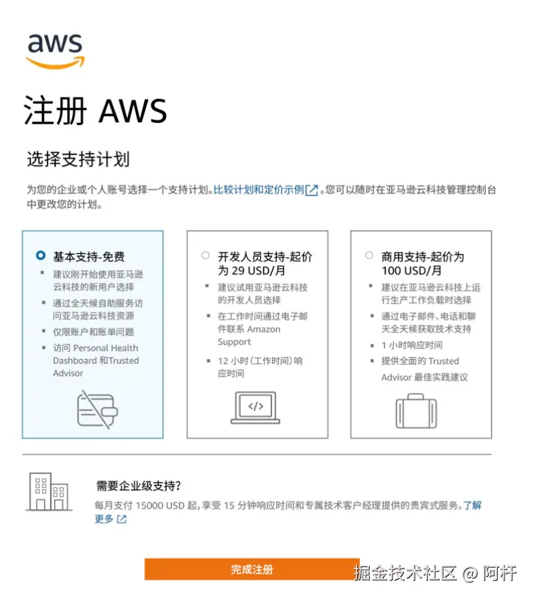 - 选择基础支持计划(无需额外开支);