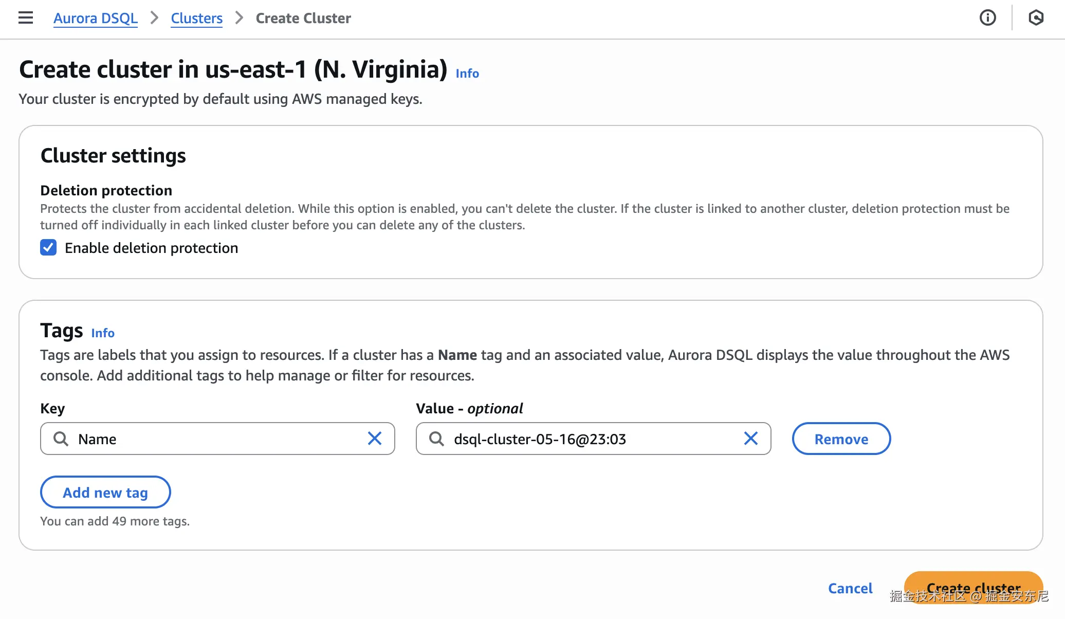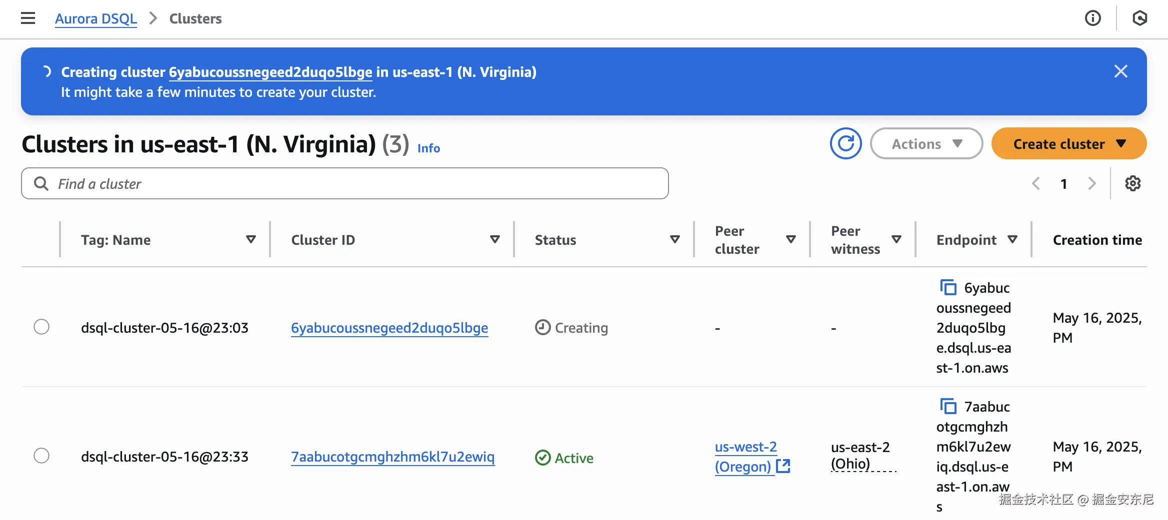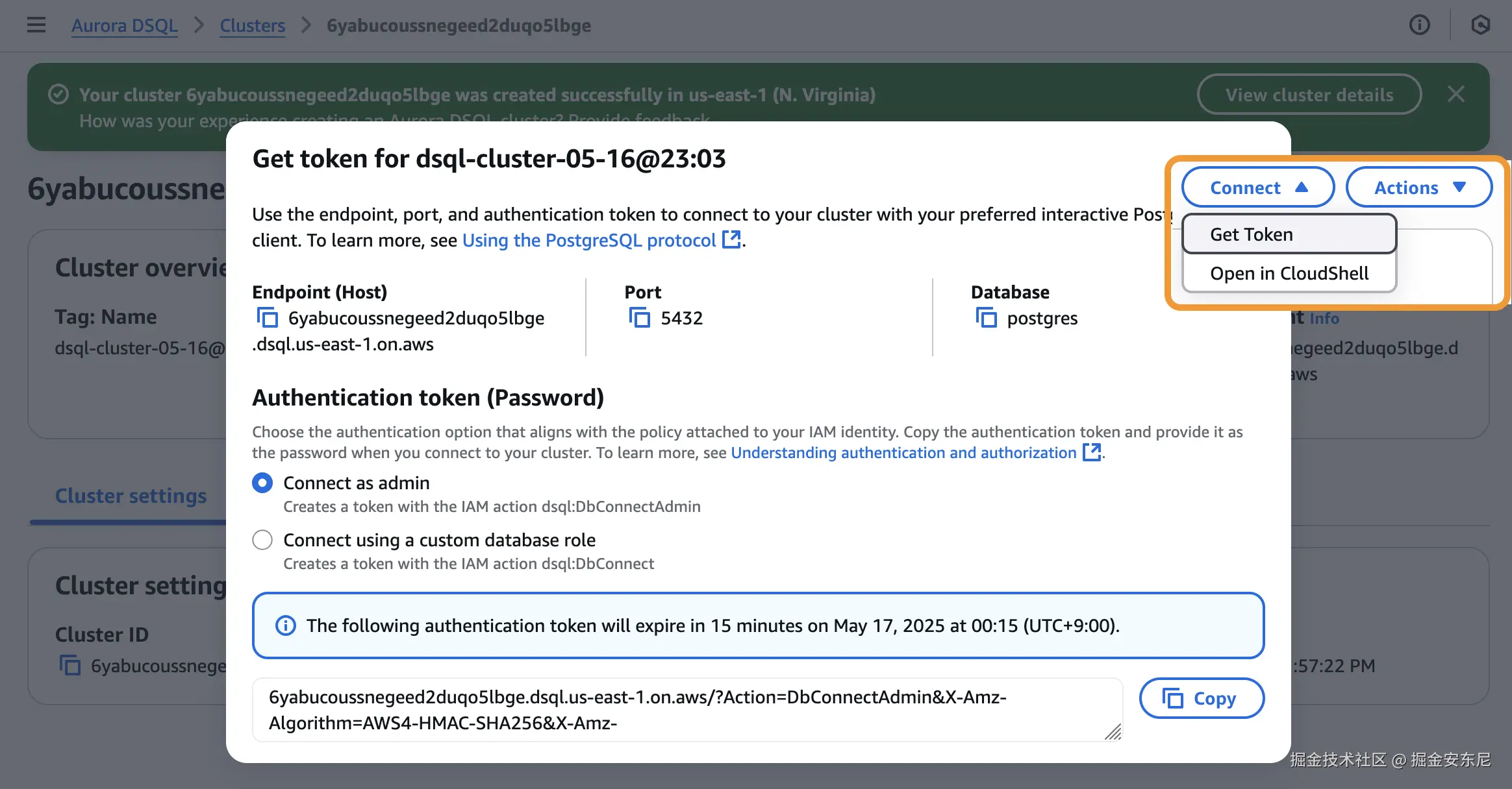 控制台点 Create cluster;几分钟后就能拿到端点和临时登录 Token。用 psql、DataGrip 或 Python psycopg 连接,跑两条 SQL 就算验收。