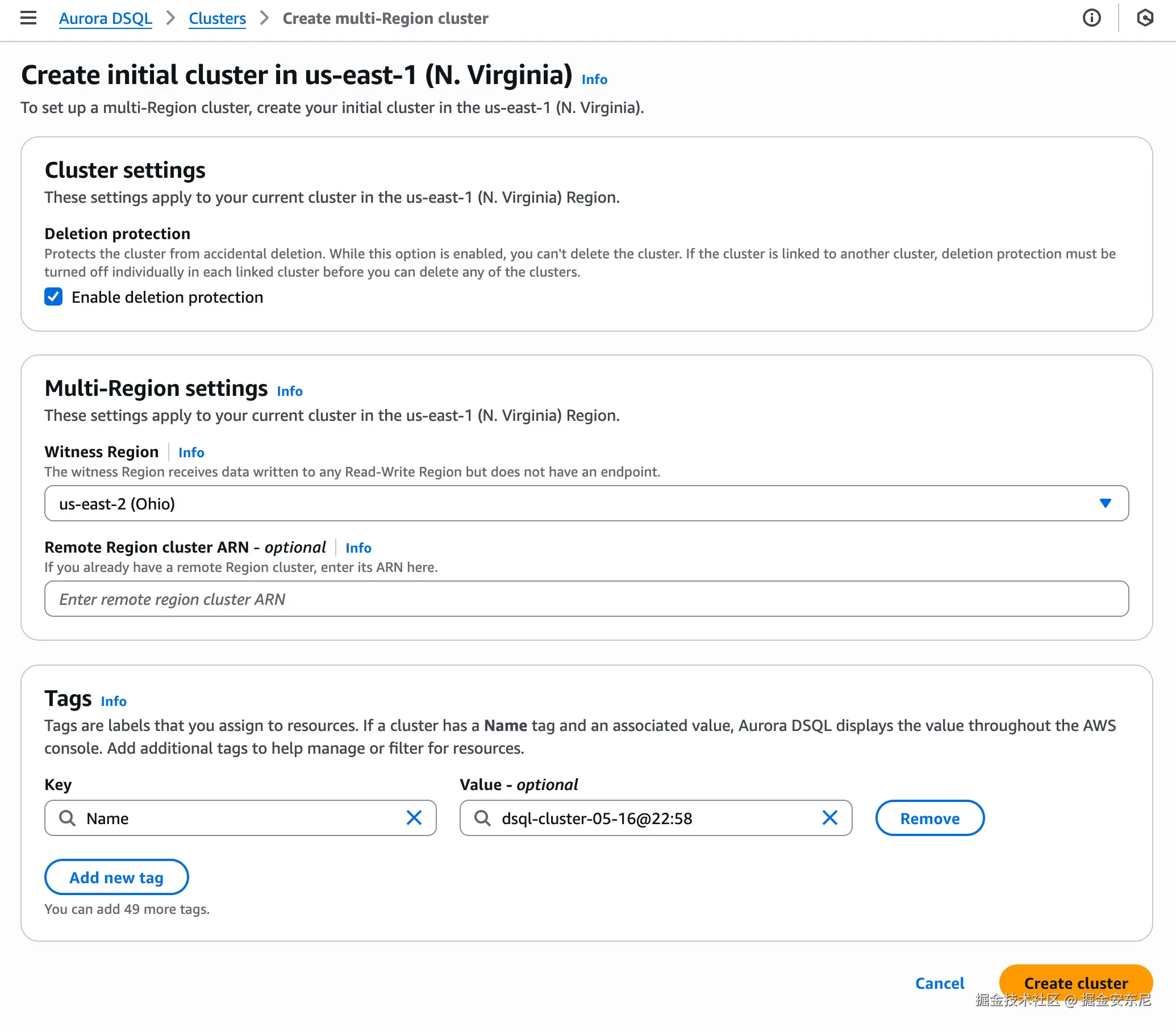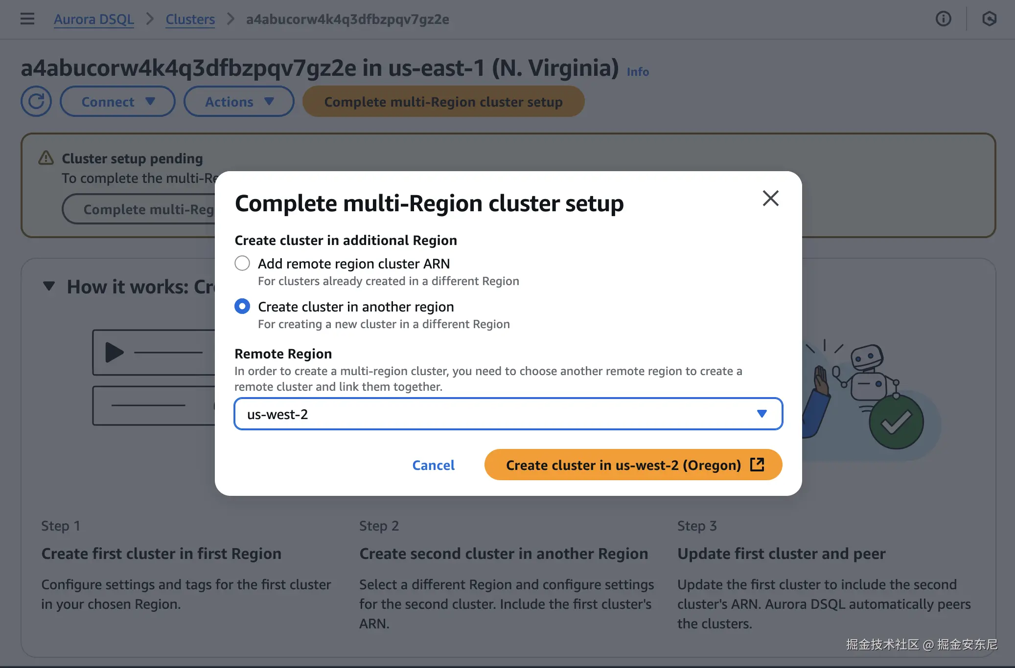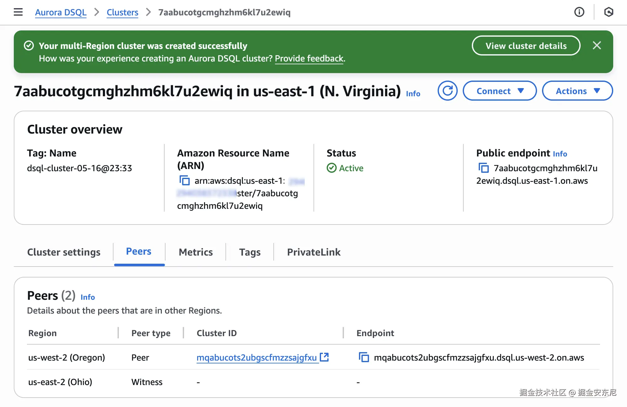 在 us-east-1 先建第一集群,顺便指定 “witness” 所在 Region。再在 eu-west-1 建第二集群,并把两者的 ARN 互相绑定 Peer。确认之后,双端点呈现同一个逻辑库,读写强一致;witness Region 只收日志。