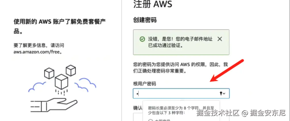 如果你还不知道怎么注册应用?打开亚马逊云科技的官网 ,然后点击右上角的创建用户按钮,创建新的账户:然后输入要创建的邮箱地址,然后点击验证邮箱地址,在邮箱中找到验证码然后输入: