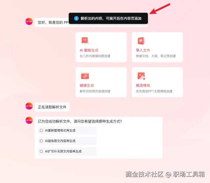 实际操作中,如果Word文档中包含了表格,在选择生成方式之前,会弹出下图的提示,可在生成PPT大纲后,展开大纲,将解析提取的表格添加到PPT内容页中。