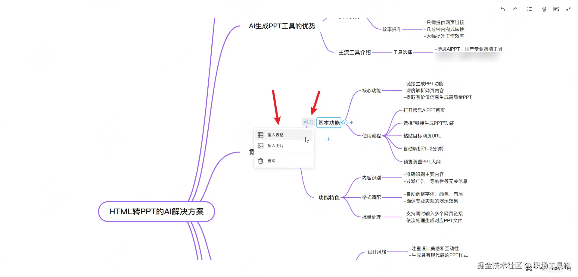 进入以思维导图视图编辑PPT大纲的界面,选中任意一个第三层级的节点,单击节点左侧的图标,在弹出的浮窗,可以看到“插入表格”和“插入图片”的选项,这里可以将Word文档包含的表格或图片添加到PPT大纲中,作为PPT的组成部分添加到PPT内容页。