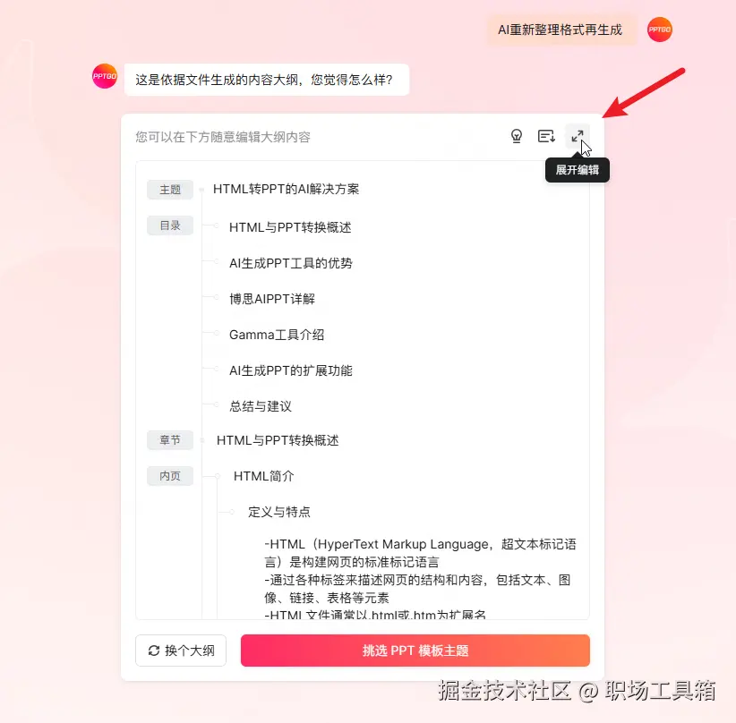 下图是博思AIPPT基于Word生成的PPT大纲,点击右上角的“展开编辑”。