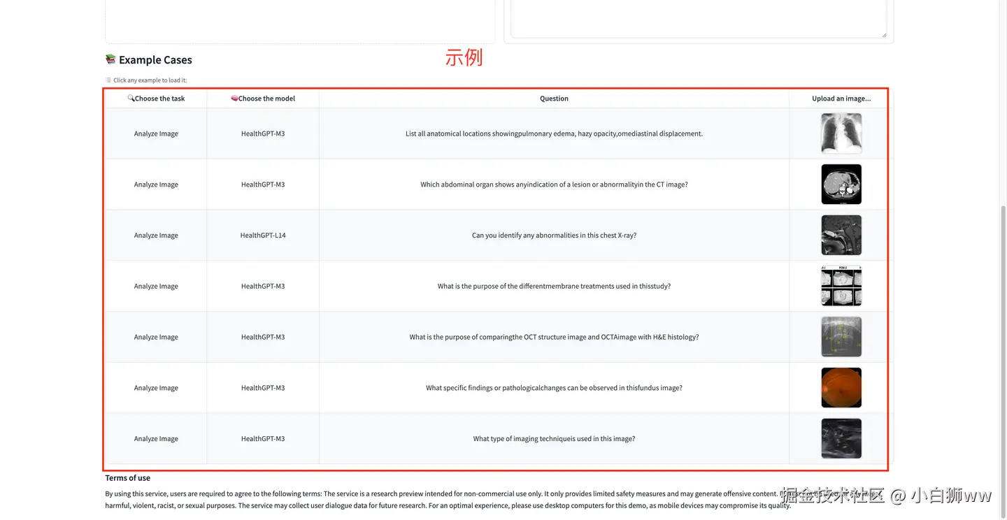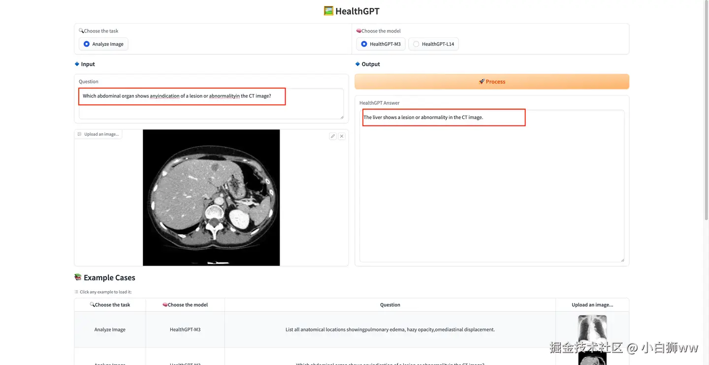 我们以示例 2 为参考进行演示,点击示例 2 的任意区域,可以看到自动输入了问题「Which abdominal organ shows anyindication of a lesion or abnormalityin the CT image?」和相应的图片,点击「Process」开始生成,HealthGPT 很快给出了分析结果,模型表示 CT 图像显示肝脏存在一个病灶或异常。