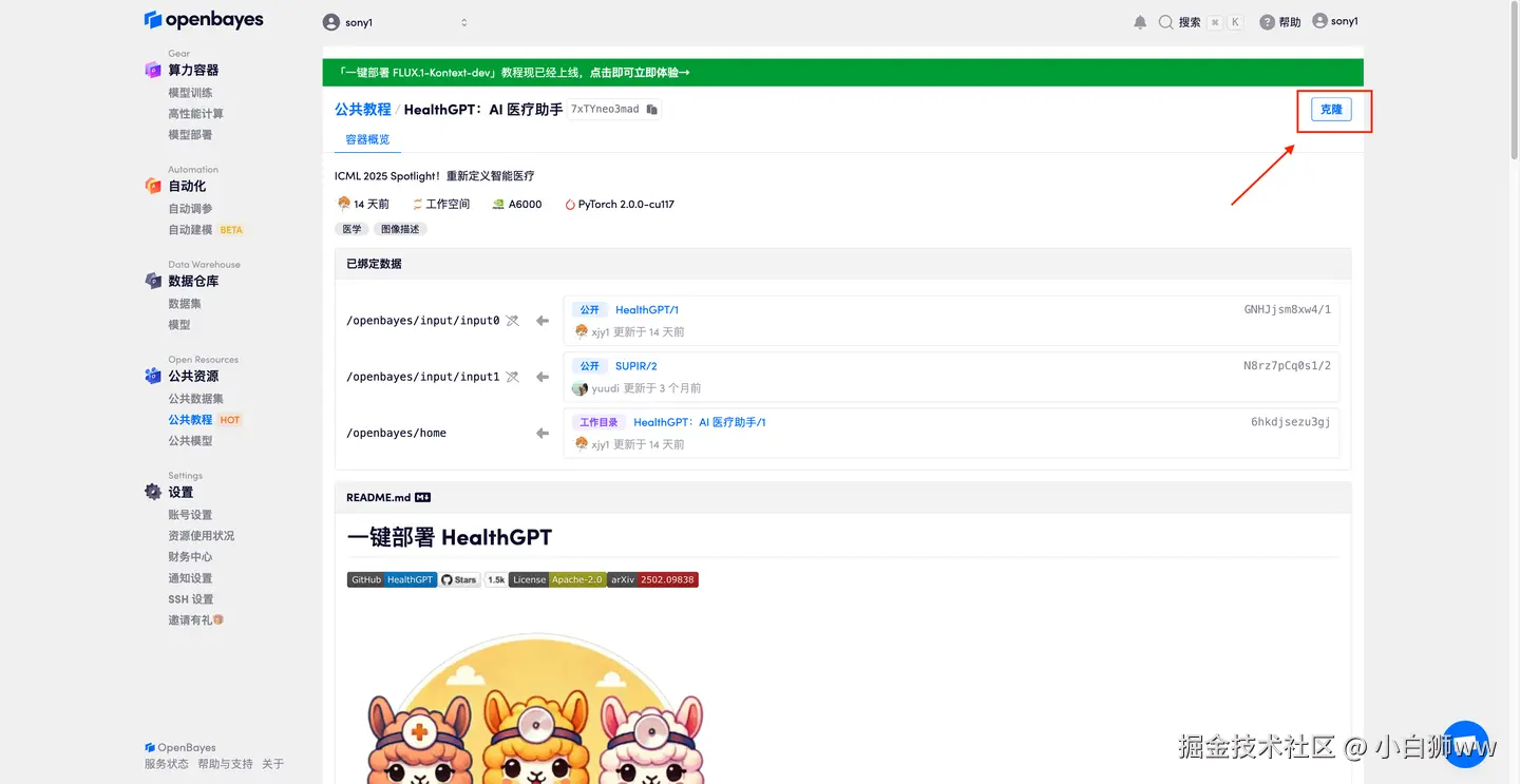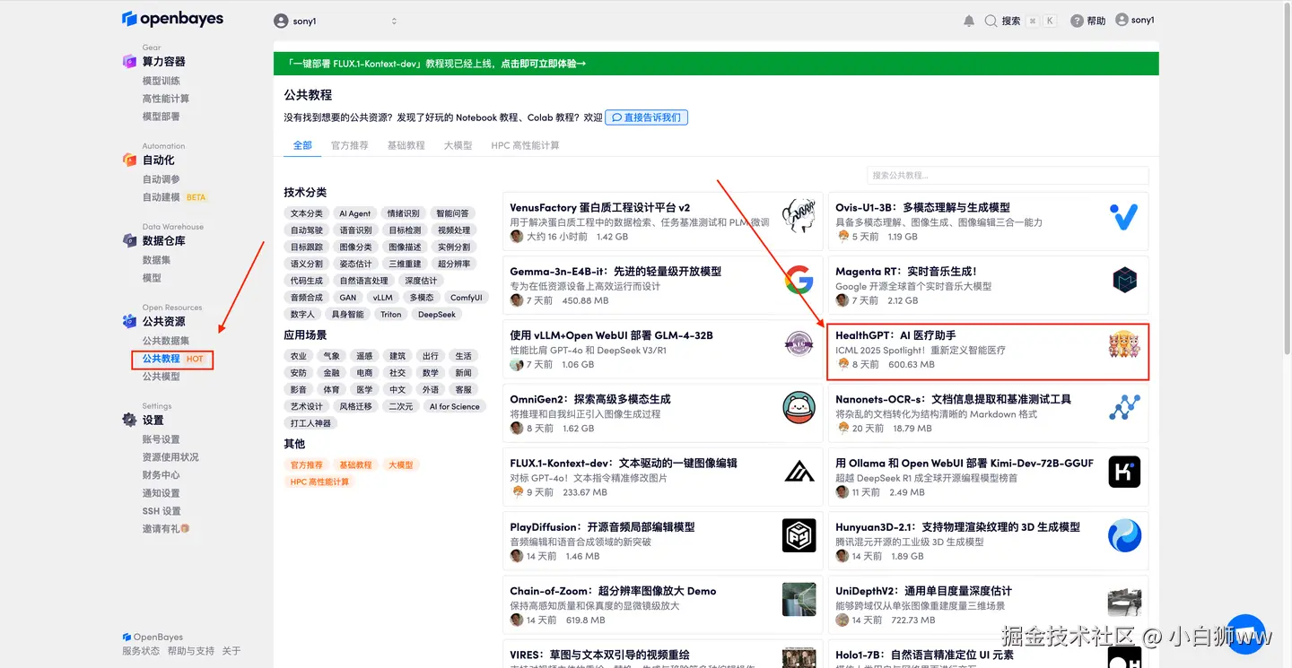 首先点击「公共教程」,在公共教程中找到「HealthGPT:AI 医疗助手」,单击打开。