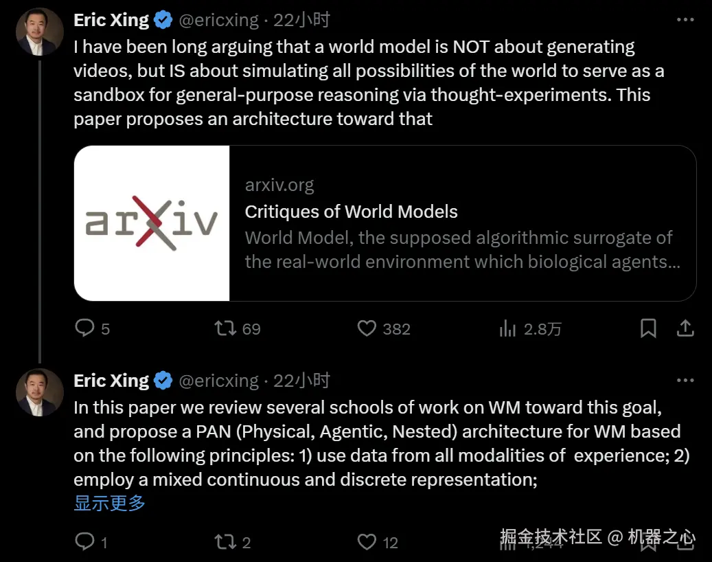 研究者表示,PAN 世界模型的详细信息及结果会很快在另一篇论文中展示。MBZUAI 校长、CMU 教授邢波在论文提交后转推了这篇论文,并表示 PAN 模型即将发布 27B 的第一版,这将是第一个可运行的通用世界模拟器。