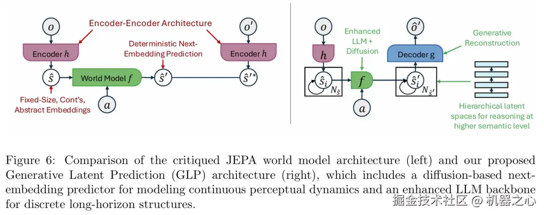如论文图 6(左半部分)所示,这种被批判的「编码器 - 编码器架构」在潜在空间中进行「确定性的下一嵌入预测」 ,但它在功能上仍是自回归的,需要递归地预测未来状态,因此并未真正避免其声称要解决的误差累积问题 。更关键的是,通过移除解码器来避免重构观察数据,会导致模型学习到的潜在表示与真实世界脱节,难以诊断,甚至可能崩溃到无意义的解 。