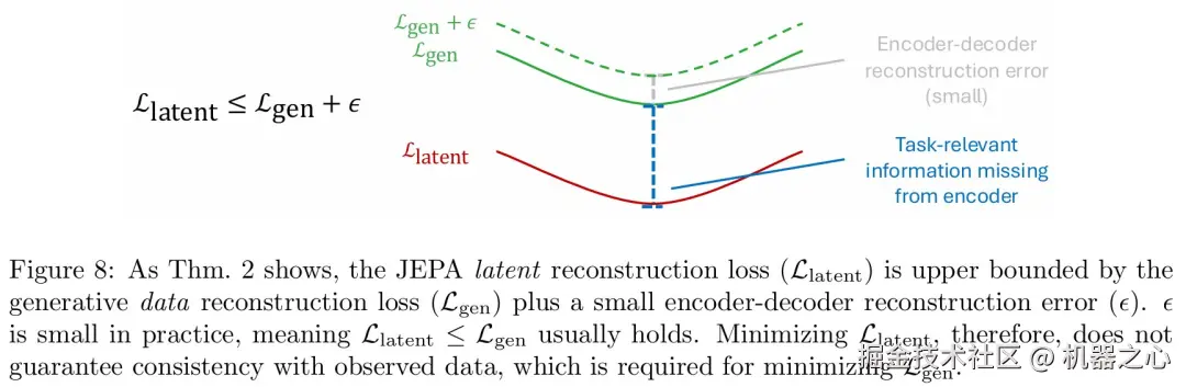 图 8 进一步从理论上解释了,潜在空间损失只是生成式损失的一个宽松的「上界代理」 。这意味着,即使一个模型的潜在损失很低,也不能保证它在真实世界中的预测是准确的,因为它可能遗漏了对任务至关重要的信息 。