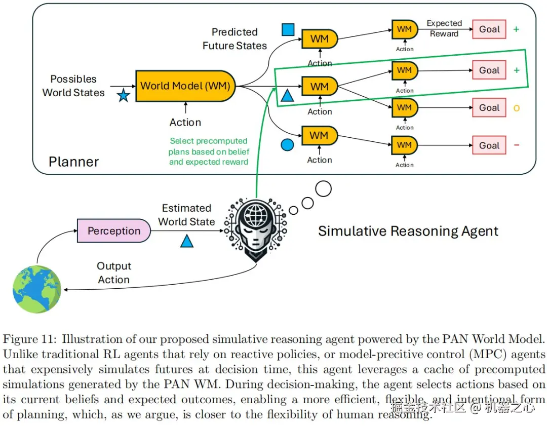 作者概述了一种利用世界模型进行模拟推理的智能体架构。PAN 自然地融入这一范式,不仅作为视频生成器,更作为一个丰富的内部沙盒,用于模拟、实验和预见未来。