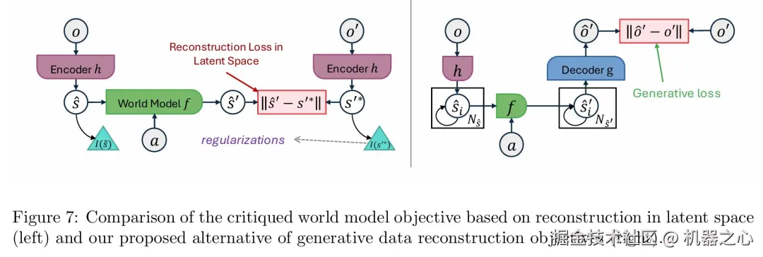 如图 7(左半部分)所示,在潜在空间计算重构损失的方法,理论上存在「平凡解崩溃」的风险 ,即模型可以轻易将所有输入映射为常数来使损失为零,从而什么也学不到 。为了防止崩溃,这类模型不得不依赖复杂且难以调试的正则化项。