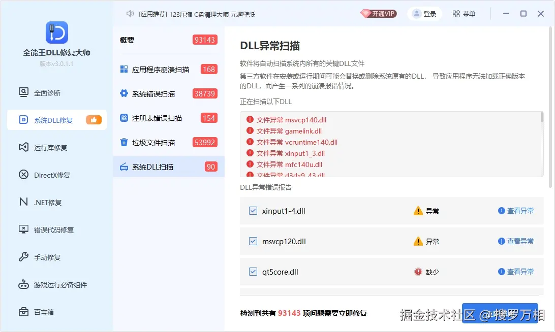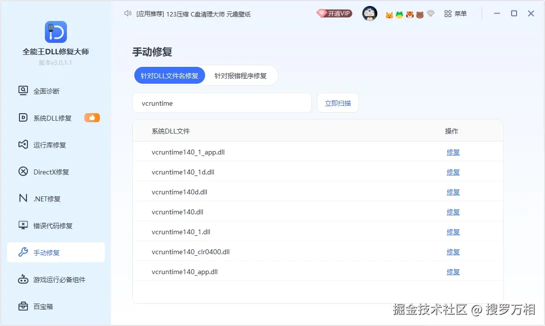 各种Windows系统dll缺失/异常/错误等问题,这款软件有VIP版,但我觉的不充钱就能解决大多数问题了。