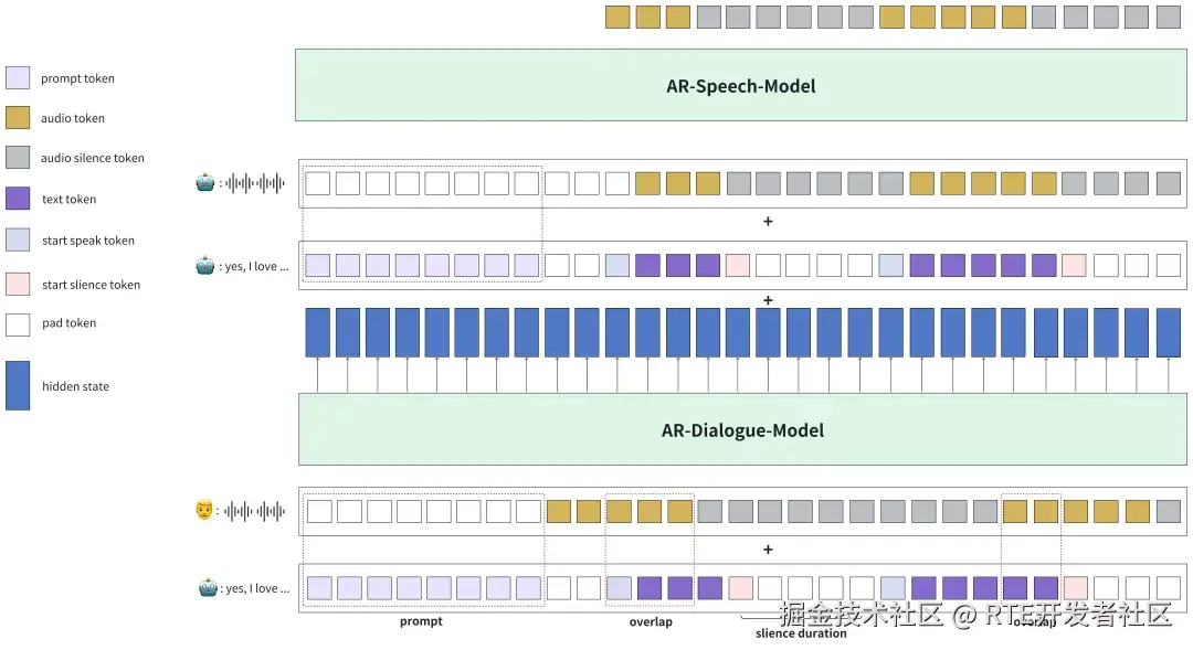 - 模型通过建模预测静音(Silence)和响应(Response)Token 任务,实现机器人的完全自主决策能力,精准控制对话节奏中的沉默与发声时机。