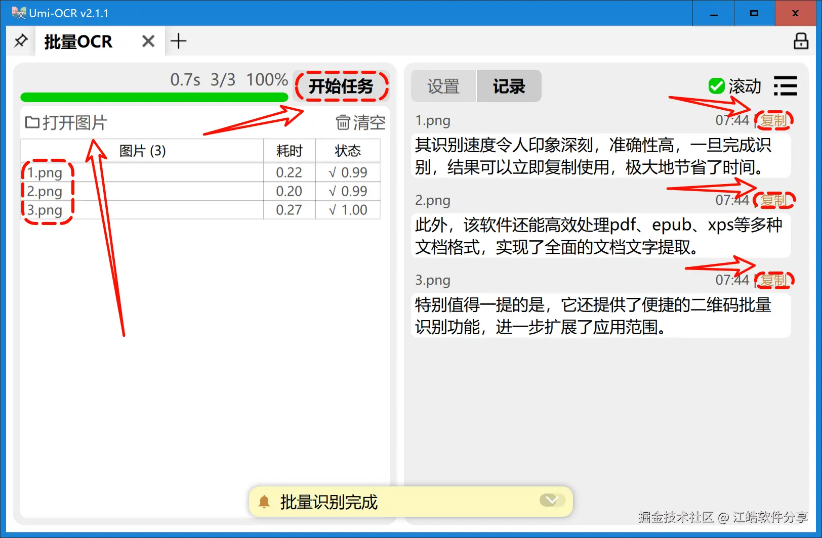 举个例子,在我的测试中导入了三张图片,通过点击“开始任务”,短时间内便完成了识别,且结果条理清晰,便于查阅。