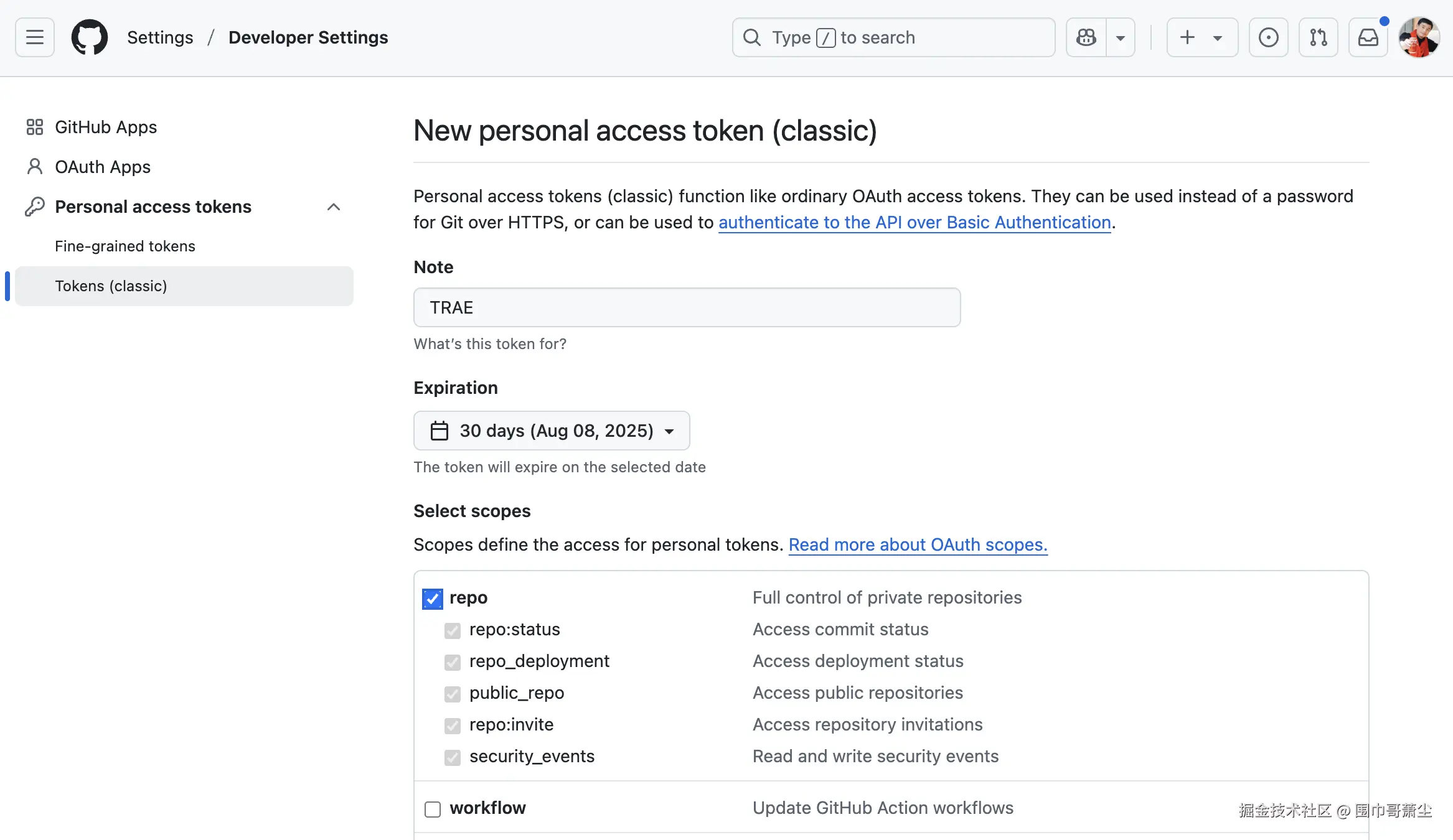 重点:获取 github 的 Token (在settings/Developer Settings下面的Tokens(classic)的Generate new toekn 下拉的 Generate new toekn(classic)里面完成Tokens创建。