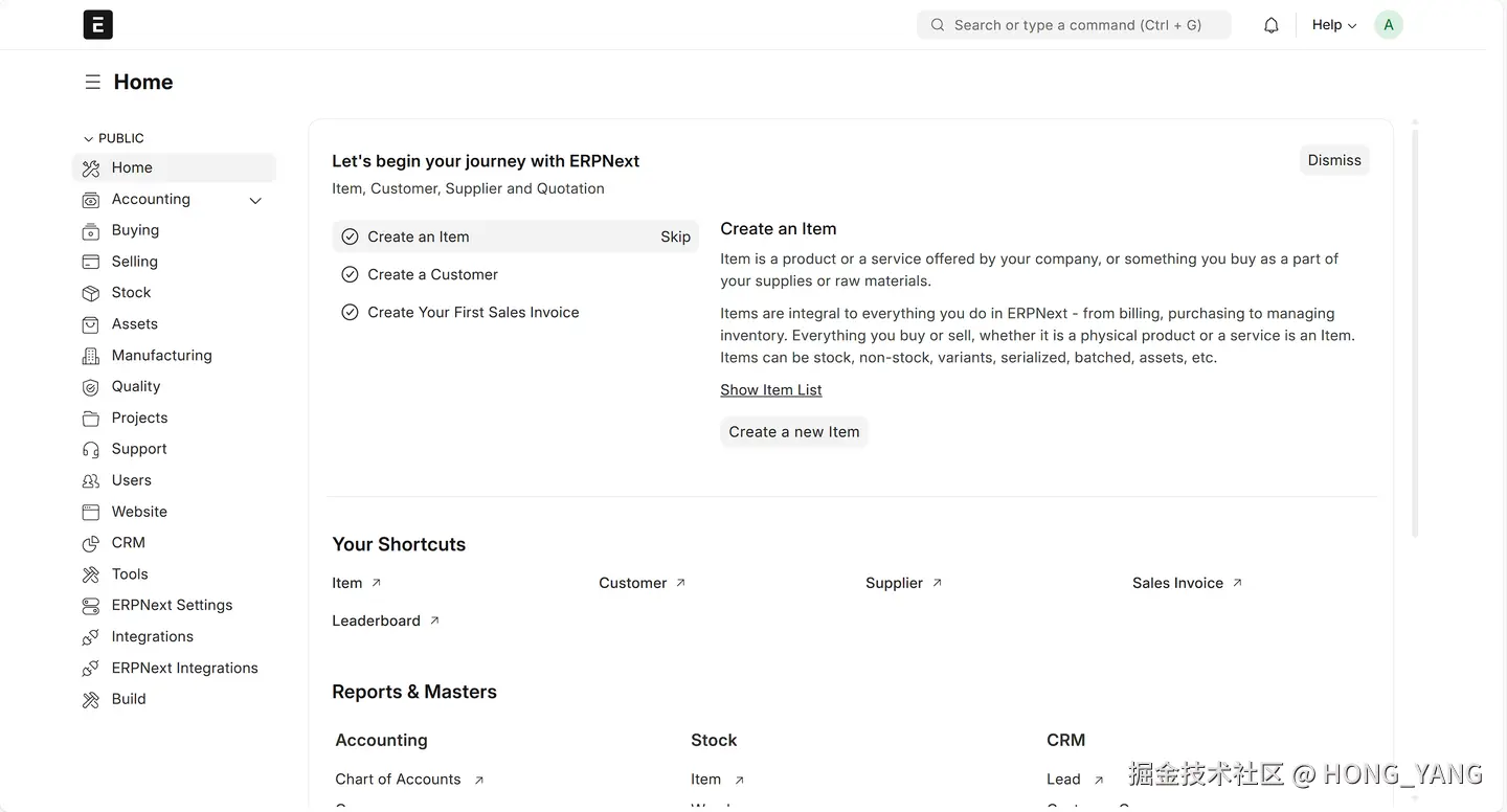 部署成功后,通过提供的访问地址进入 ERPNext 页面,使用管理员账号登录,完成公司信息、财务年度、业务模块等基础设置。