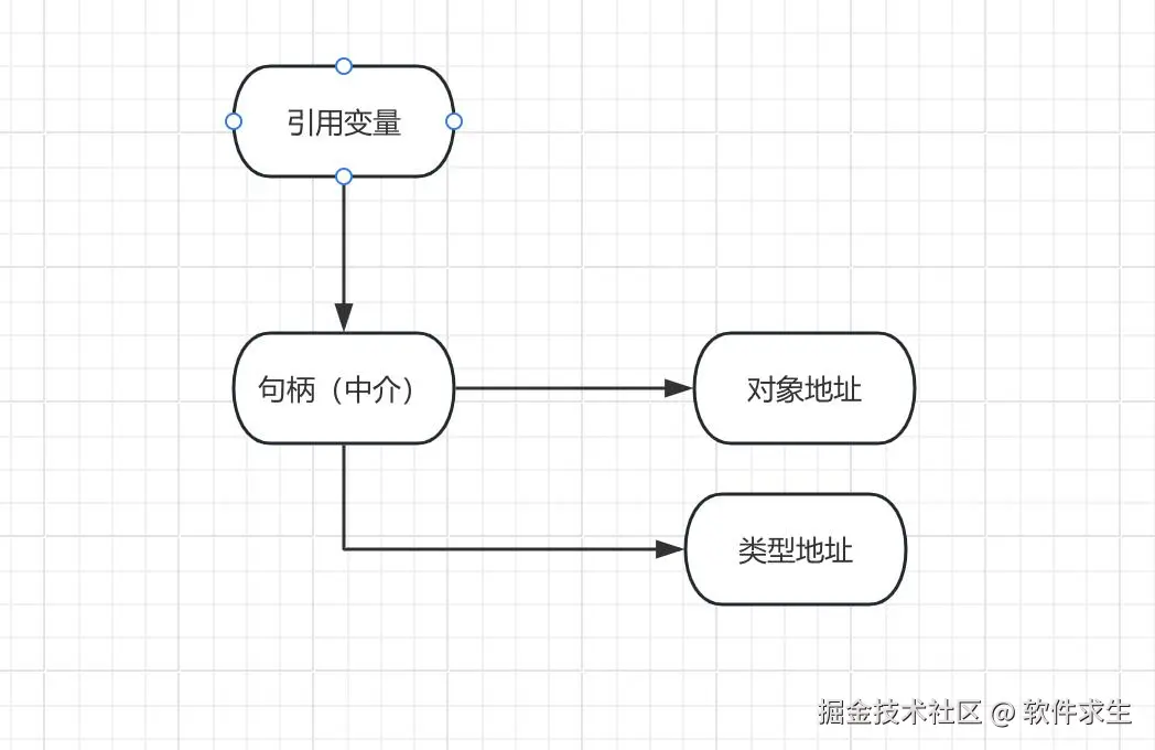 JVM 会在内存中专门划一块区域,叫句柄池(Handle Pool),每个对象的引用会指向句柄池中的一个句柄对象,句柄再保存两个重要地址:对象数据地址、类型元数据地址。