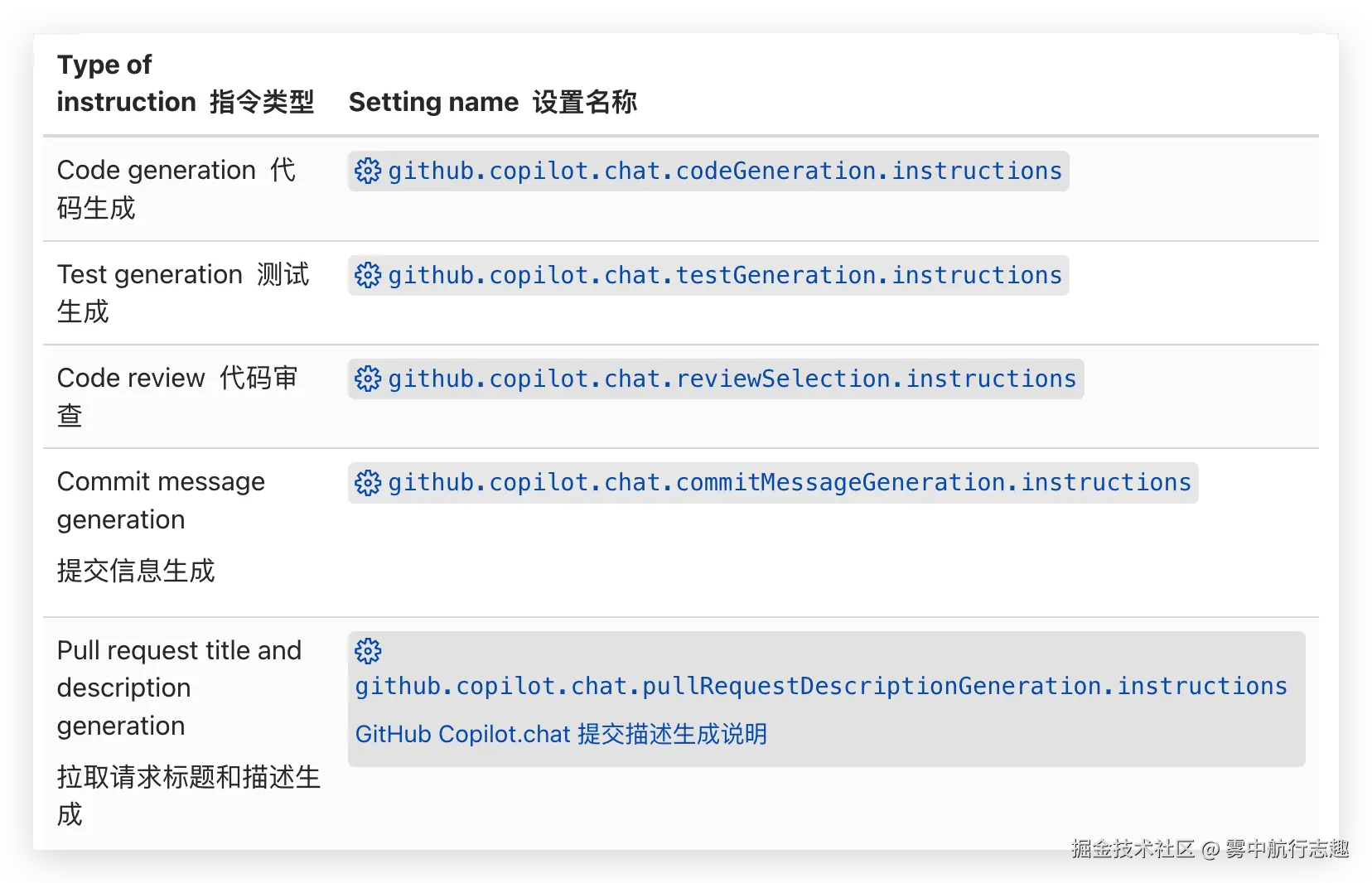 .github/copilot-instructions.md:每次发起对话都会携带给大模型的信息--使用此文件来定义适用于所有代码生成任务的一般编码规范、首选技术以及项目要求。 .instructions.md: 更精细化或者更充分的context ,可以通过通配符去匹配哪些文件可以用,支持主动调用(进阶玩法,我基本没有这样用)- vs code 设置里自定义,参照下面这个图,它的意义在于每个细微的场景都想兼顾