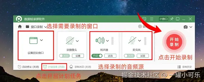 步骤2:接下来就可以根据需求自定义选择录制的窗口了。在音频设置模块,如果需要录制设备播放的系统声音,可以开启 “系统声音” 选项;如果需要添加个人解说,则启用 “麦克风” 输入。特别的是,软件支持 “计划任务” 功能,通过设定具体开始时间,就可以实现定时自动录制,无需手动操作。完成所有参数调整后,点击 “开始录制” 按钮就可以启动录制流程了。