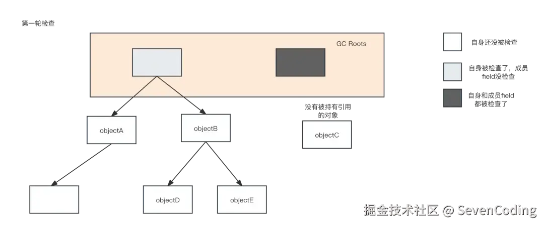 第一轮检查,找到所有的GC Roots,GC Roots被标记为灰色,有的GC Roots因为没有成员Field则被标记为黑色。