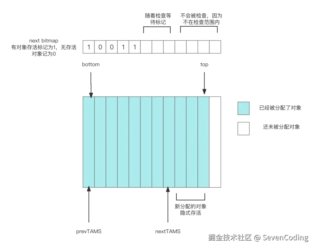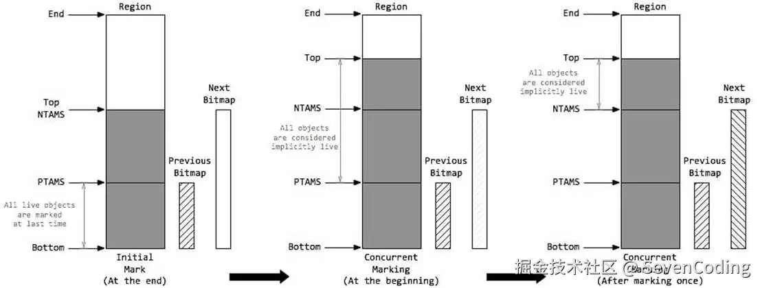 要标记存活的对象,每个分区都需要创建位图(Bitmap)信息来存储标记数据,来确定标记周期内被分配的对象。G1采用了两个位图Previous Bitmap、Next Bitmap,来存储标记数据,Previous位图存储上次的标记数据,Next位图在标记周期内不断变化更新,同时Previous位图的标记数据也越来越过时,当标记周期结束后Next位图便替换Previous位图,成为上次标记的位图。同时,每个分区通过顶部开始标记(TAMS),来记录已标记过的内存范围。同样的,G1使用了两个顶部开始标记Previous TAMS(PTAMS)、Next TAMS(NTAMS),记录已标记的范围。