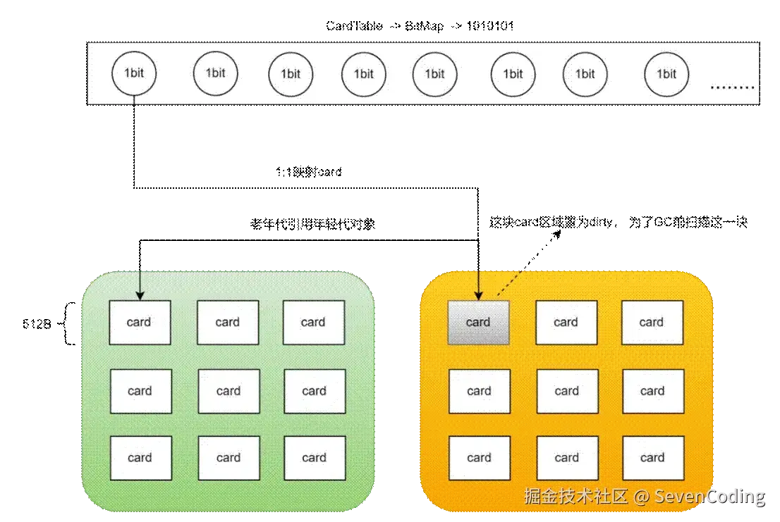 card表可以记录每一块card内存区域是否dirty。如果在发生YGC时,怎么知道那些是存活对象,并且其它代区域有没有引用这部分对象,于是把region划分了很多card区域, 每个区域大小不超过512b,当该card区域里的对象有引用关系,将当前card置为“dirty”, 并且使用卡表(CardTable)来记录每一块card是否dirty,在进行GC时,不用遍历所有的空间, 只需要遍历卡表中为"dirty"。