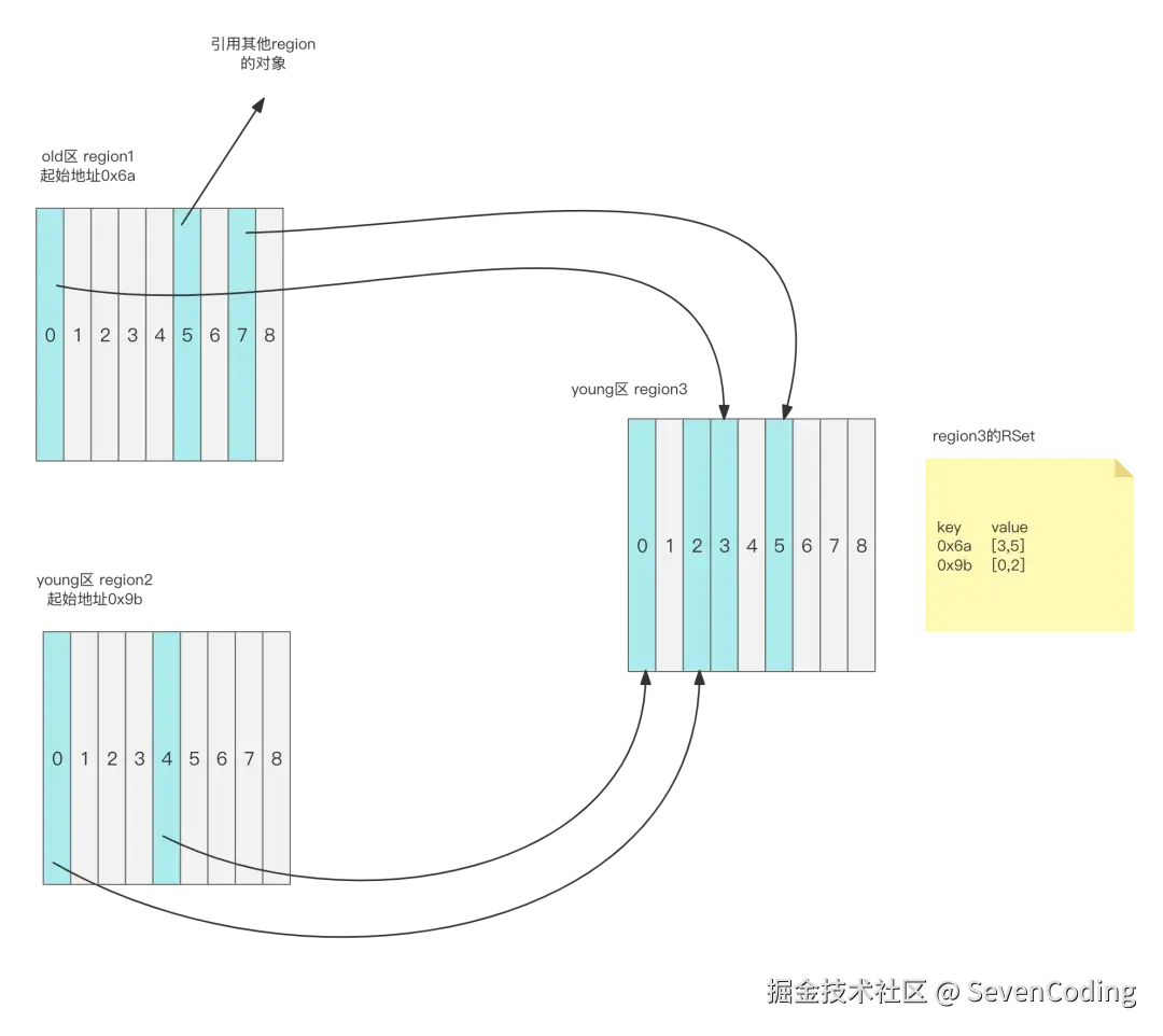 除了卡表,每个region中都含有Remember Set,简称RSet。RSet其实是hash表,key为引用本region的其他region起始地址,value为本region中被key对应的region引用的card索引位置。