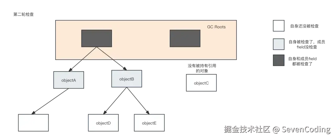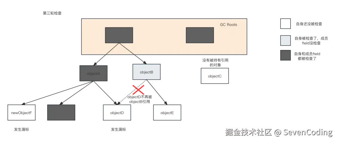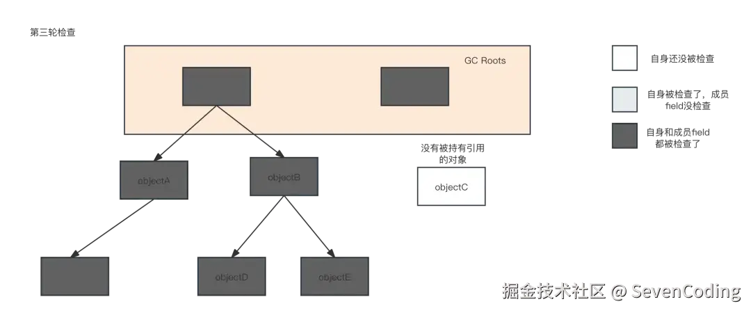 第三轮检查,循环之前的步骤,将被标记为灰色对象的子Field检查。因为这里就假设了3次循环检查的对象,所以是最后一次检查。这一路检查结束,还是白色的对象就是可以被回收的对象。即图例里的objectC
