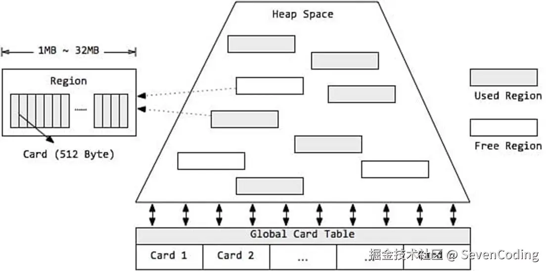 Card Table是Region的内部结构划分。每个region内部被划分为若干的内存块,被称为card。这些card集合被称为card table,卡表。