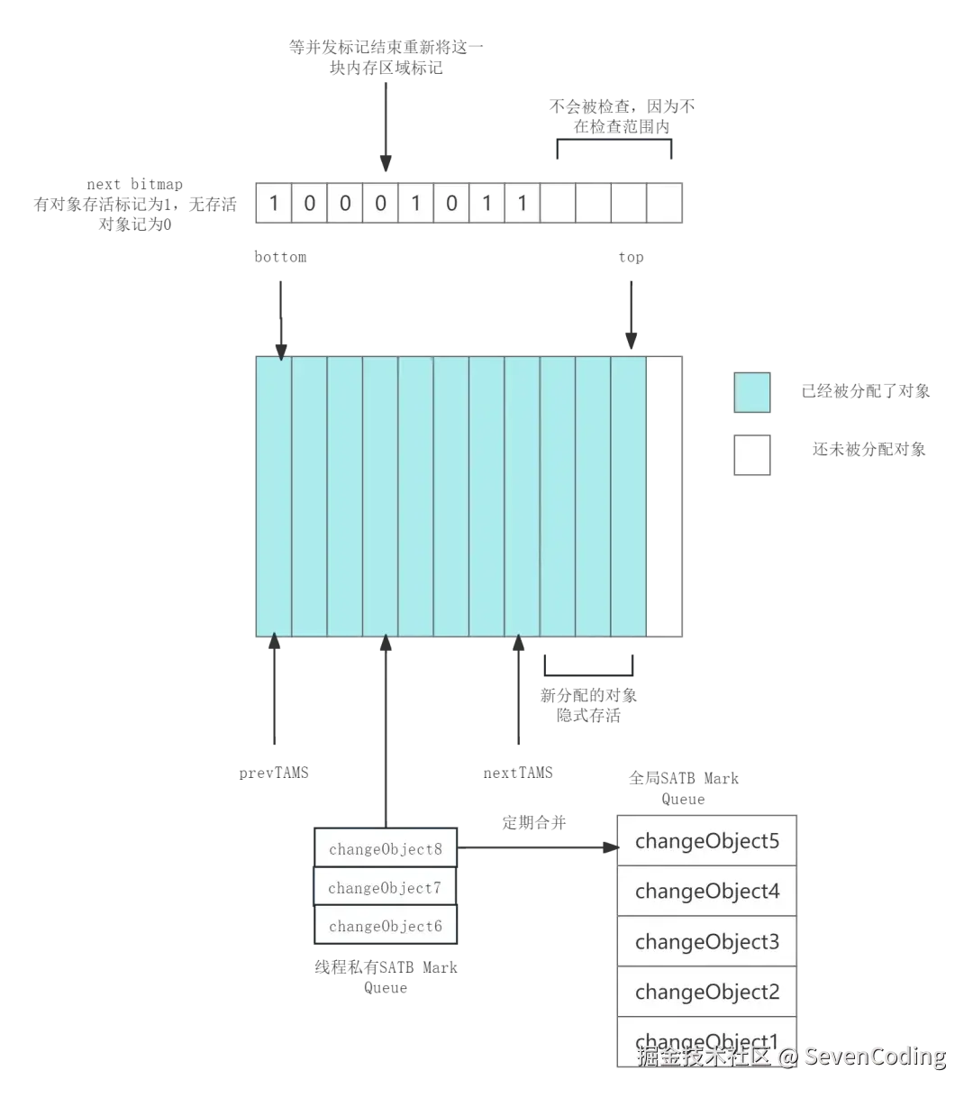 因为这一步是和mutator(用户线程)并发运行的,所以从根节点扫描的时候其实是扫描的一个快照snapshot,快照位置就是prevTAMS到nextTAMS(注意快照位置是不变的,但是prevTAMS到nextTAMS之间的对象在扫描过程中会改变)。 当region中分配新对象时,新对象都会分配在nextTAMS之后,这导致top指向的位置也往后移动,nextTAMS和top之间选哪个都是被认为隐式存活。 还有这期间也有可能应该被扫描的位置prevTAMS和nextTAMS之间的位置引用发生了变化,比如白色对象被黑色对象持有了,这就是三色标记算法的缺陷,需要更改白色对象的状态。这里会将引用被更改的对象放入satb_mark_queue。satb_mark_queue是一个队列,里面记录所有被改变引用关系的白色对象。这里指的satb_mark_queue指的全局的queue。除了全局的queue,每个线程也有自己的satb mark queue,全局的queue的引用是由所有其他线程的satb mark queue合并得来的,线程的satb mark queu满了会被转移到全局satb mark queue。且并发标记阶段会定期检查全局satb mark queue的容量,超过某个容量就concurrent marker线程就会将全局satb mark que和线程satb mark que的对象都取出来全部标记上,当然也会将这些对象的子field全部压栈(marking stack)等待接下来被标记到,这个处理类似于全局dirty card quene。这里注意。