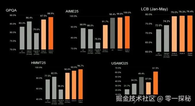 在推理基准测试上Grok 4的表现在AIME25取得了满分。