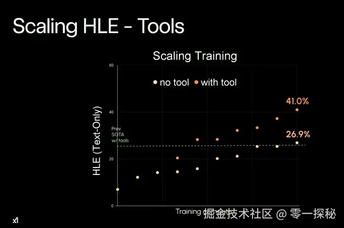 从xAI公布的数据图表来看。模型的智能水平与投入的计算资源。呈现出明显的正相关关系。下图是没用工具的情况。