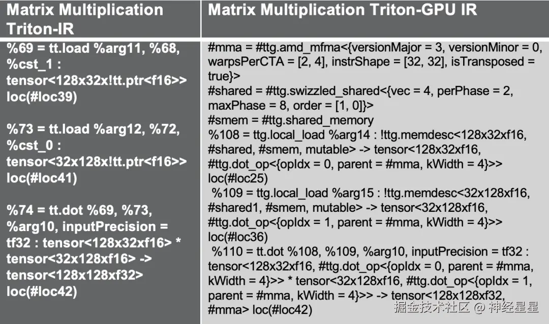 首先,针对 AMD GPU 的加速矩阵乘法, 优化重点在于 Triton 中点乘操作的输入/输出布局,使其更好地兼容 AMD 的矩阵计算单元(如 Matrix)。该优化涉及大量针对 CDNA 架构的匹配处理,是整个实现中工作量较大的一部分。如果希望在 AMD 平台上对 Triton 生成的代码进行深度优化,这部分实现值得重点参考。