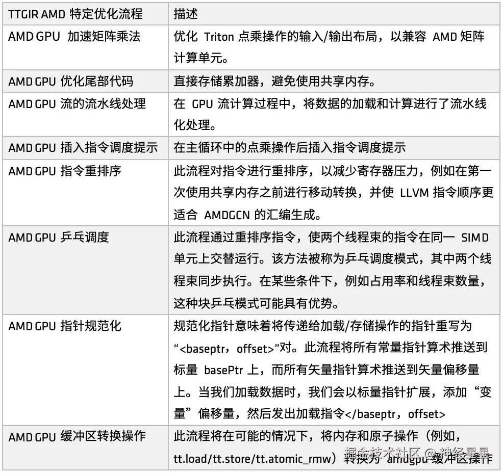 在 AMD 平台上,Triton-IR 优化流程由 make_ttgir 函数定义,用于提升 GPU 性能。基于 AMD GPU 特点和优化经验,我们还开发了特定的优化流程,如下图所示: