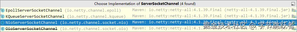2 处:选择服务 Scoket 实现类,其中 NioServerSocketChannel 表示基于 NIO 的服务器端实现,其它实现还有