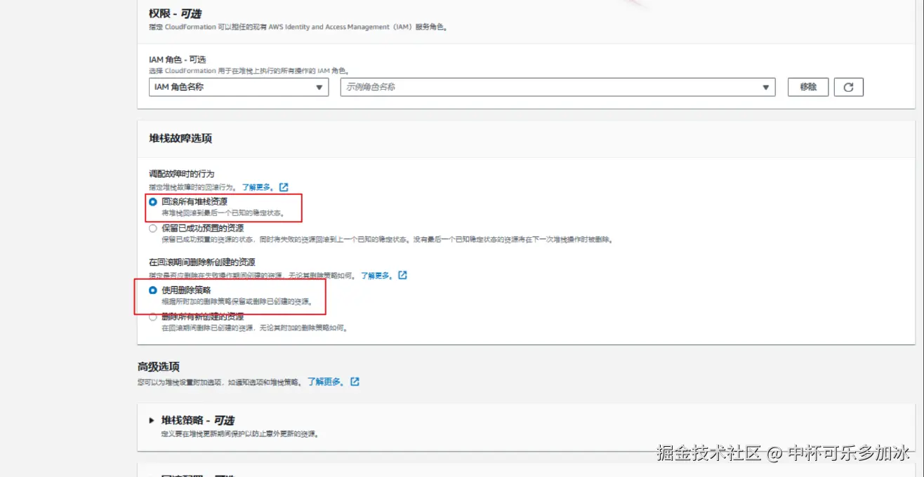 - 在堆栈选项页面,可设置回滚配置、权限等选项,其中回滚所有堆栈资源能够将堆栈回滚到上一个稳定状态,保留那些已成功配置的资源,而失败的资源会回滚到一个稳定的状态。如果没有成功过,失败的资源会在下一次堆栈更新时被清理。使用删除策略可以根据每个资源的删除策略来决定是保留还是删除已创建的资源。