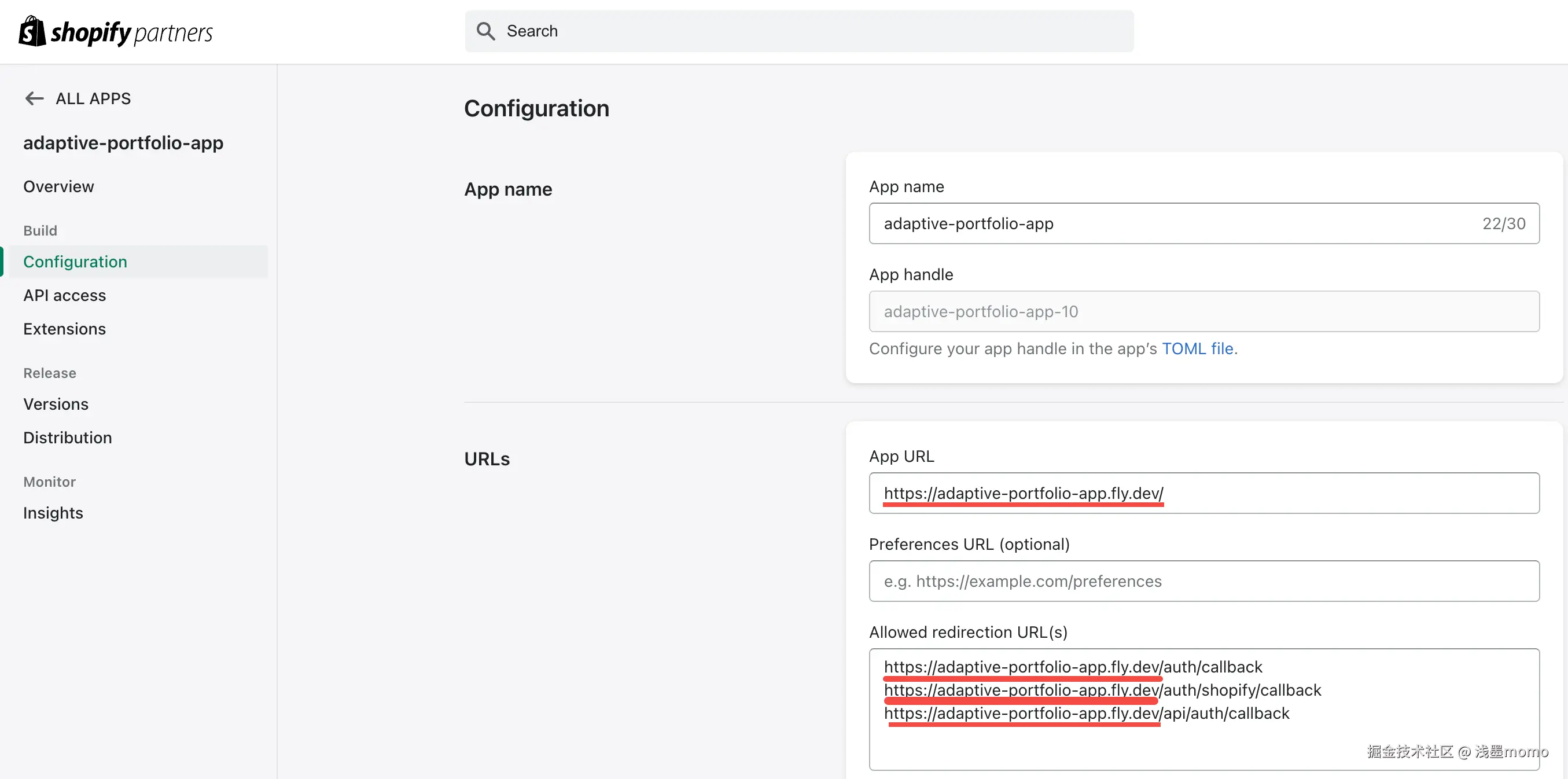 进入Shopify Partner后台,然后进入App的Configuration页面,将前面步骤中的部署到fly.io的url填入到以下地方