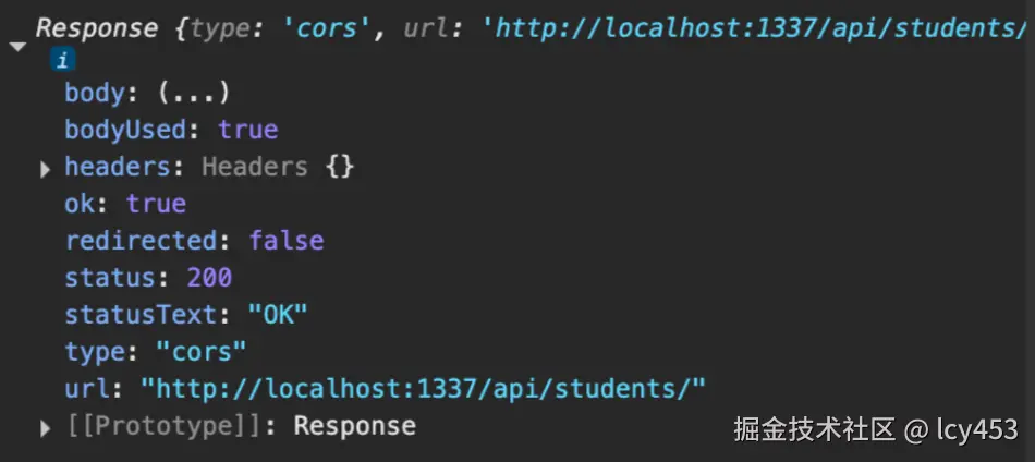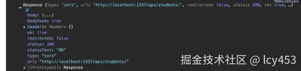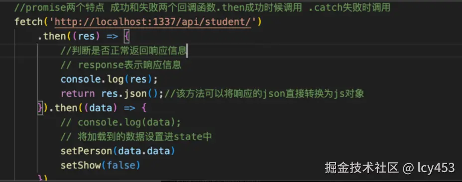 上面网页可以看到我们路由是/api/students,那么我们就可以尝试去用fetch(浏览器自带的发送请求的api,是浏览器提供的全局函数,返回的一个promise)所以可以用链式调用.then.catch因为promise有状态,请求成功自动执行.then失败会自动调用.catch而且参数就是返回的promise实例对象。