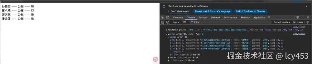 这里我们没有写fetch发送请求的类型,所以是get。这里展示数据成功,说明访问成功之后把数据返回来了,但是第一次是json类型