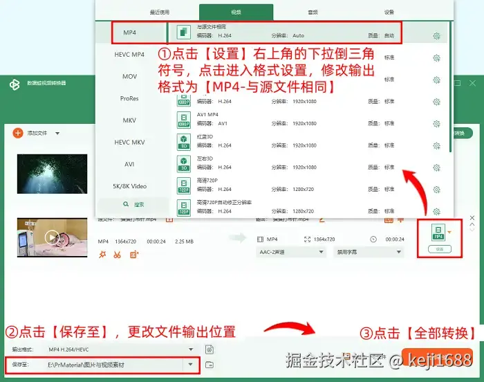 步骤3:点击【设置】右上方的下拉选项框,然后更改输出视频文件的格式为你想要的视频格式,建议更改为【MP4】格式更容易被不同的媒体播放器所兼容,然后选择输出视频的质量为【与源文件相同】。