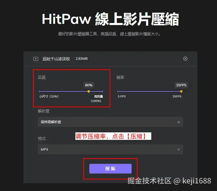 HitPaw视频压缩工具同样是一款网页压缩工具,它的优点是操作方便,缺点是每次只能够压缩一个视频文件,对于需要快速压缩大量视频的朋友并不是特别快捷的工具。