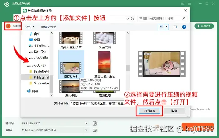 步骤1:双击位于桌面的数据蛙视频转换器图标,然后点击首页【转换】界面的【添加文件】字样按钮,选择出我们需要压缩的视频素材,并且点击【打开】。