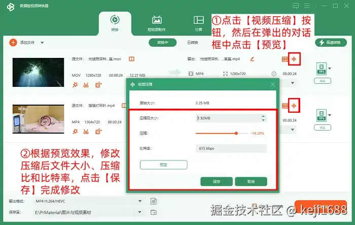 步骤2:点击位于列表右侧的【视频压缩】的按钮,进入到【视频压缩】的参数设置窗口之后,点击【预览】,查看当前的视频压缩效果,根据预览效果调节输出文件和压缩率的大小,然后点击【保存】按钮将我们的更改进行保存。