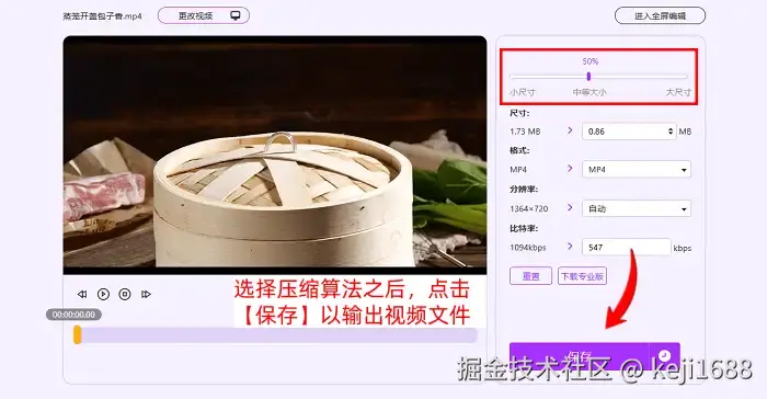 操作方法:点击上传视频文件,之后选择压缩算法,并且点击【保存】以获取输出视频。