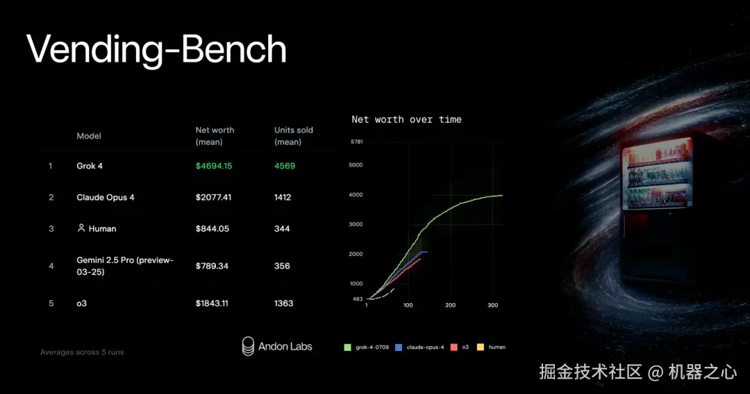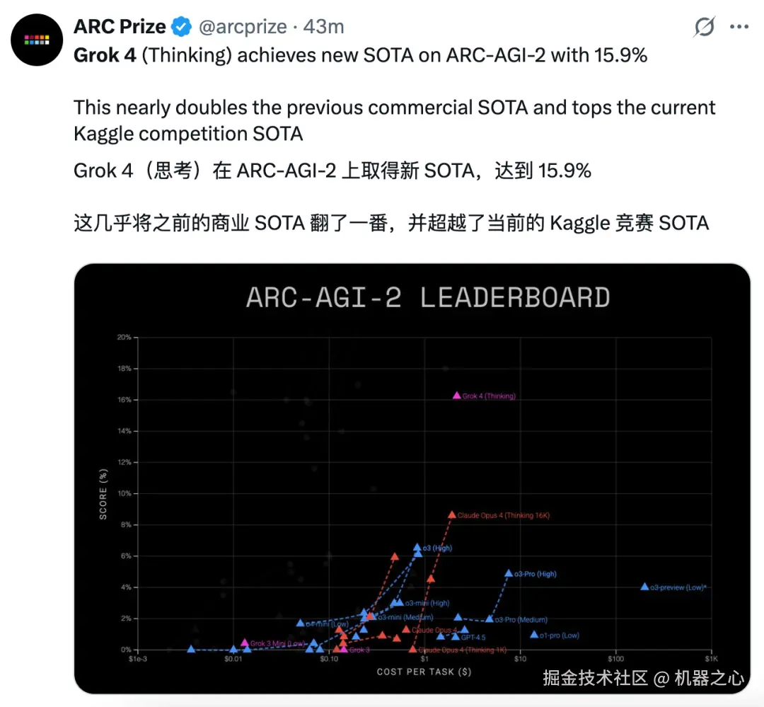 可以看到,Grok 4 相较于 Claude Opus 4、Human、Gemini 2.5 Pro、o3 取得了领先。