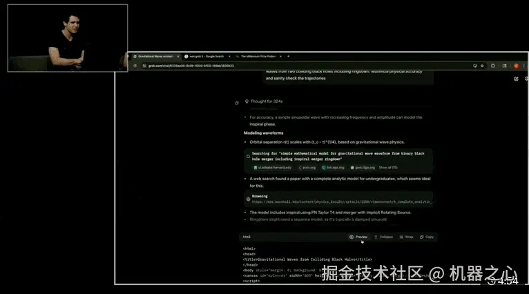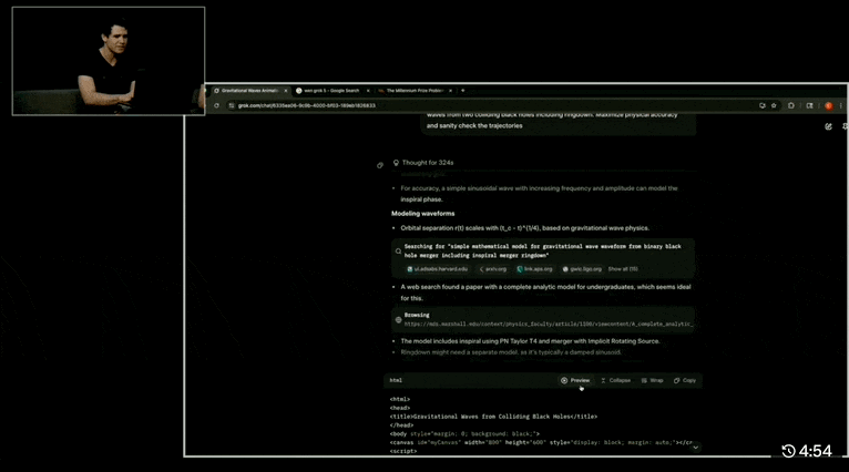 Grok 4 几乎完整地呈现了从两个黑洞接近到最后合并结束的引力波模拟效果。动图的一边是推理过程和计算的步骤和代码,查阅的论文每一篇都有链接。