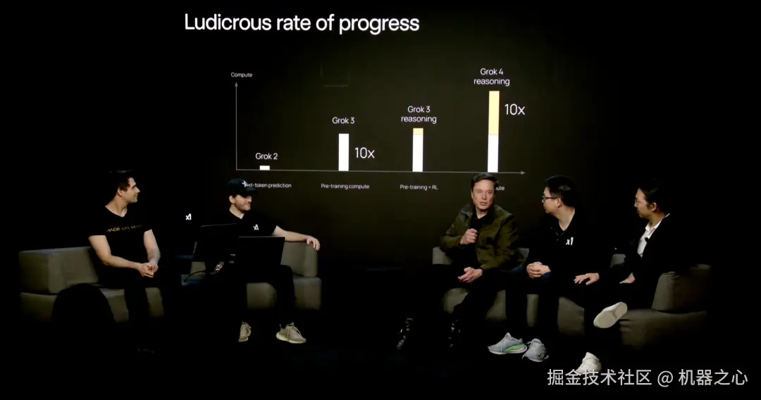 得益于计算能力的增强、强化学习的训练,Grok 4 的推理能力相较于前代提升了 10 倍。从 Grok 2 到 Grok 4,采用的技术范式不同,分别为下一个 token 预测、预训练计算、预训练 + RL、RL 计算。