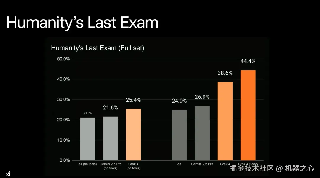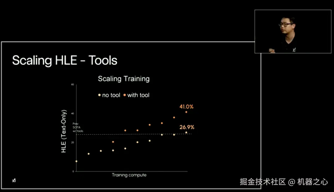 在今天的直播中,xAI 研究人员表示,以往的 SOTA 模型在使用工具(with tool)的情况下,成绩最高可以达到 41.0%。